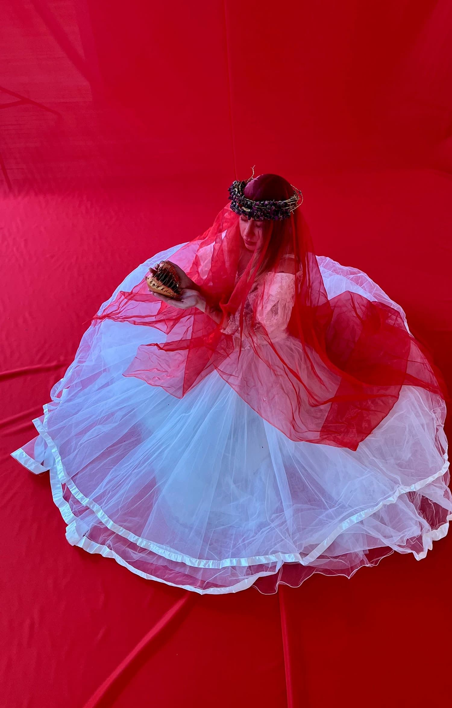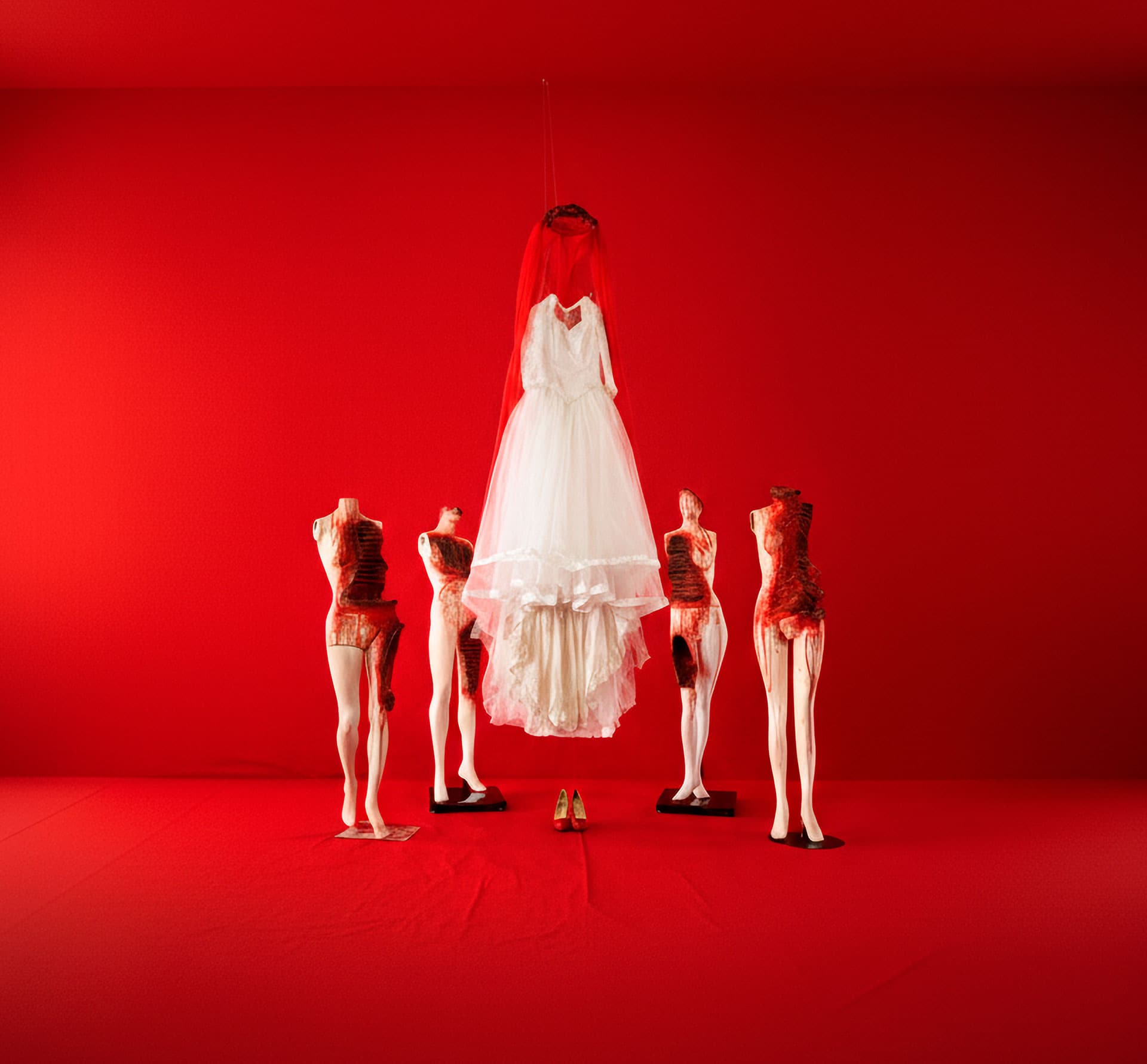 La instalación en sala integra cuatro cuerpos intervenidos junto a un vestido de novia suspendido, velo rojo y corona de espinas, configurando un espacio donde vulnerabilidad, fe y resistencia coexisten. El proyecto se expande mediante el videoarte “Nocturno”, inspirado en el poema ‘Nocturno del Descendimiento’ de Gabriela Mistral, profundizando en la experiencia de pérdida, dolor y esperanza.