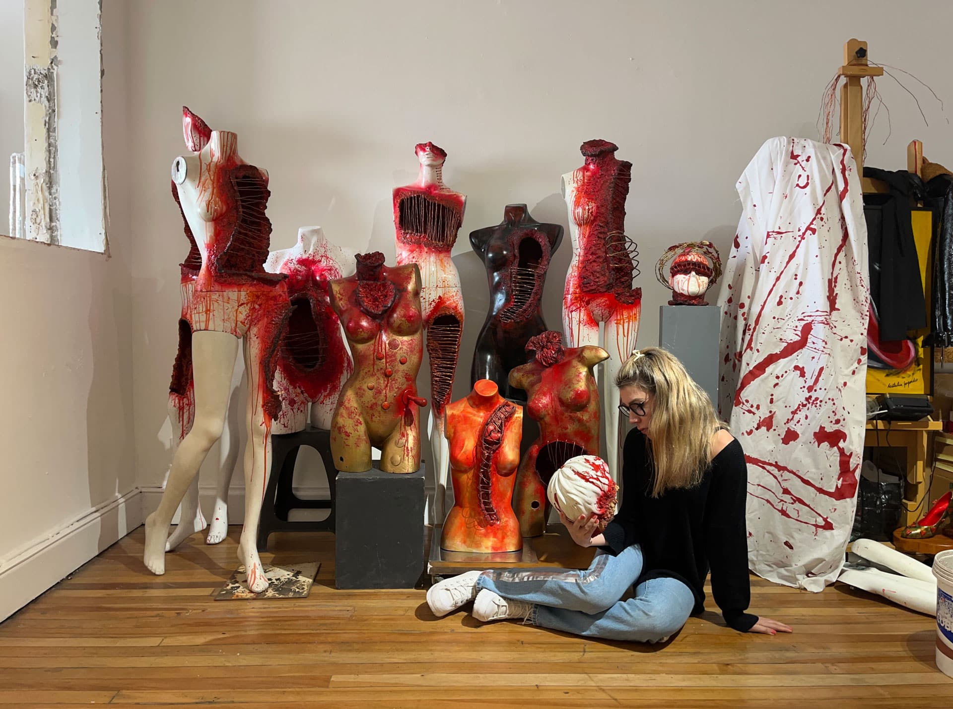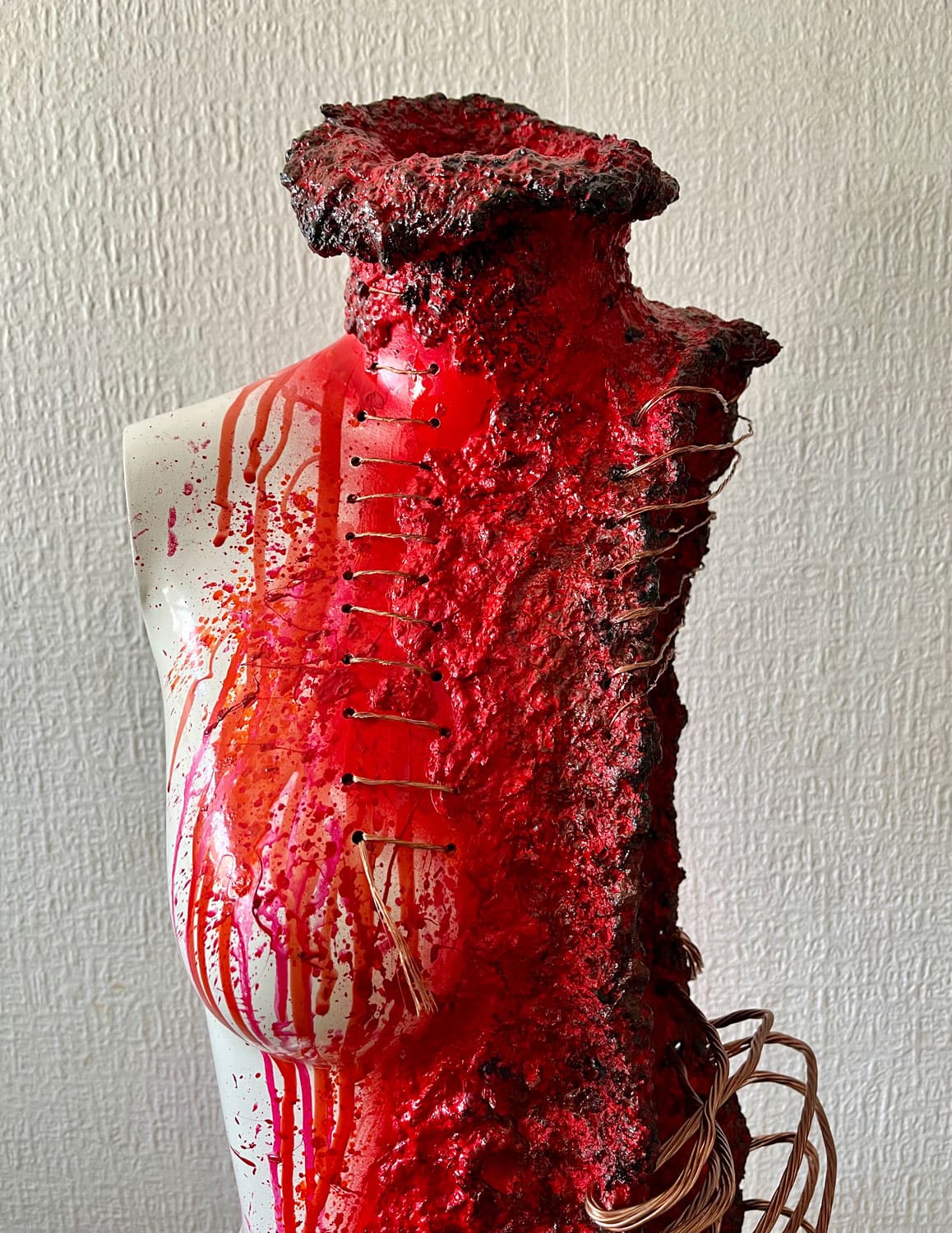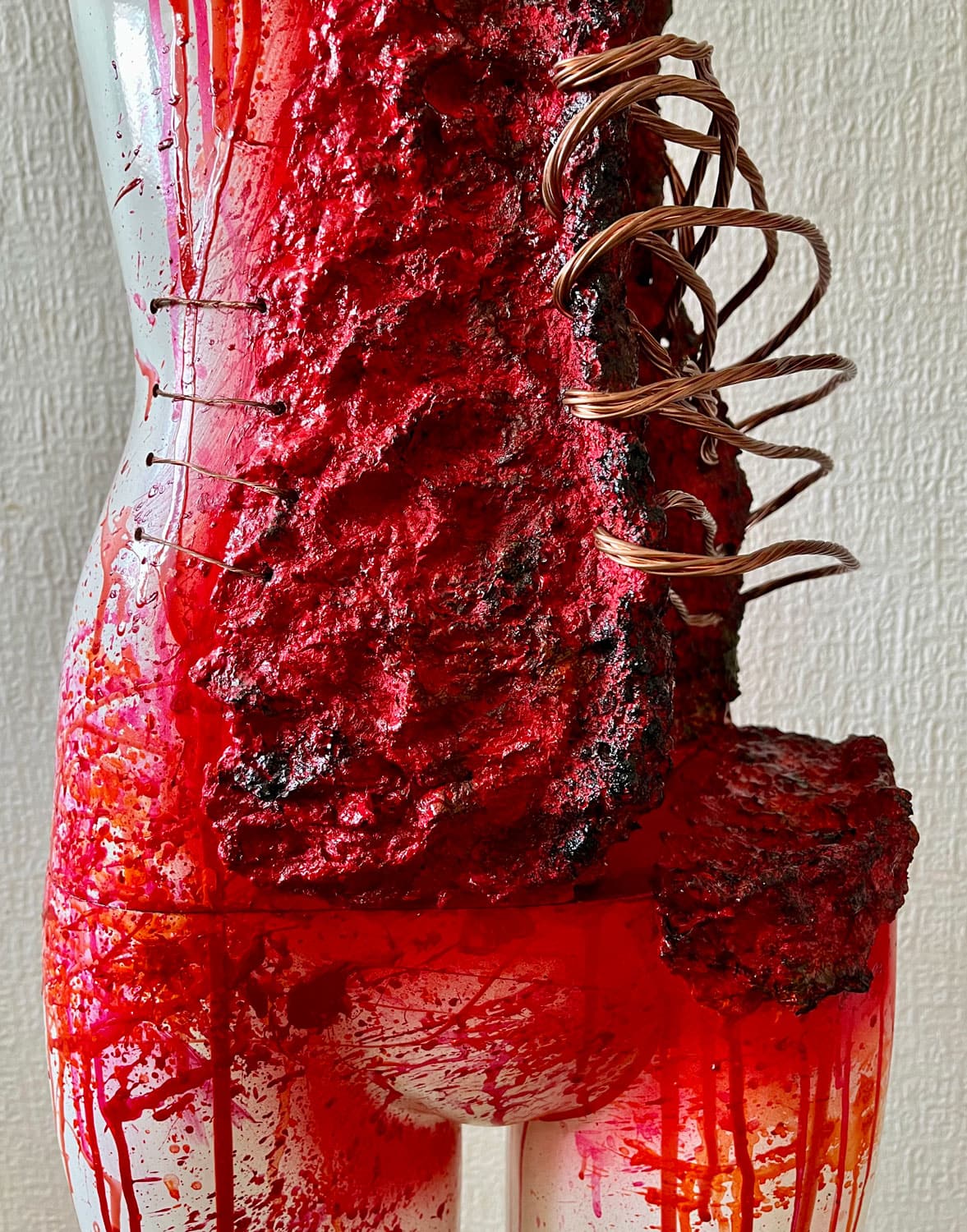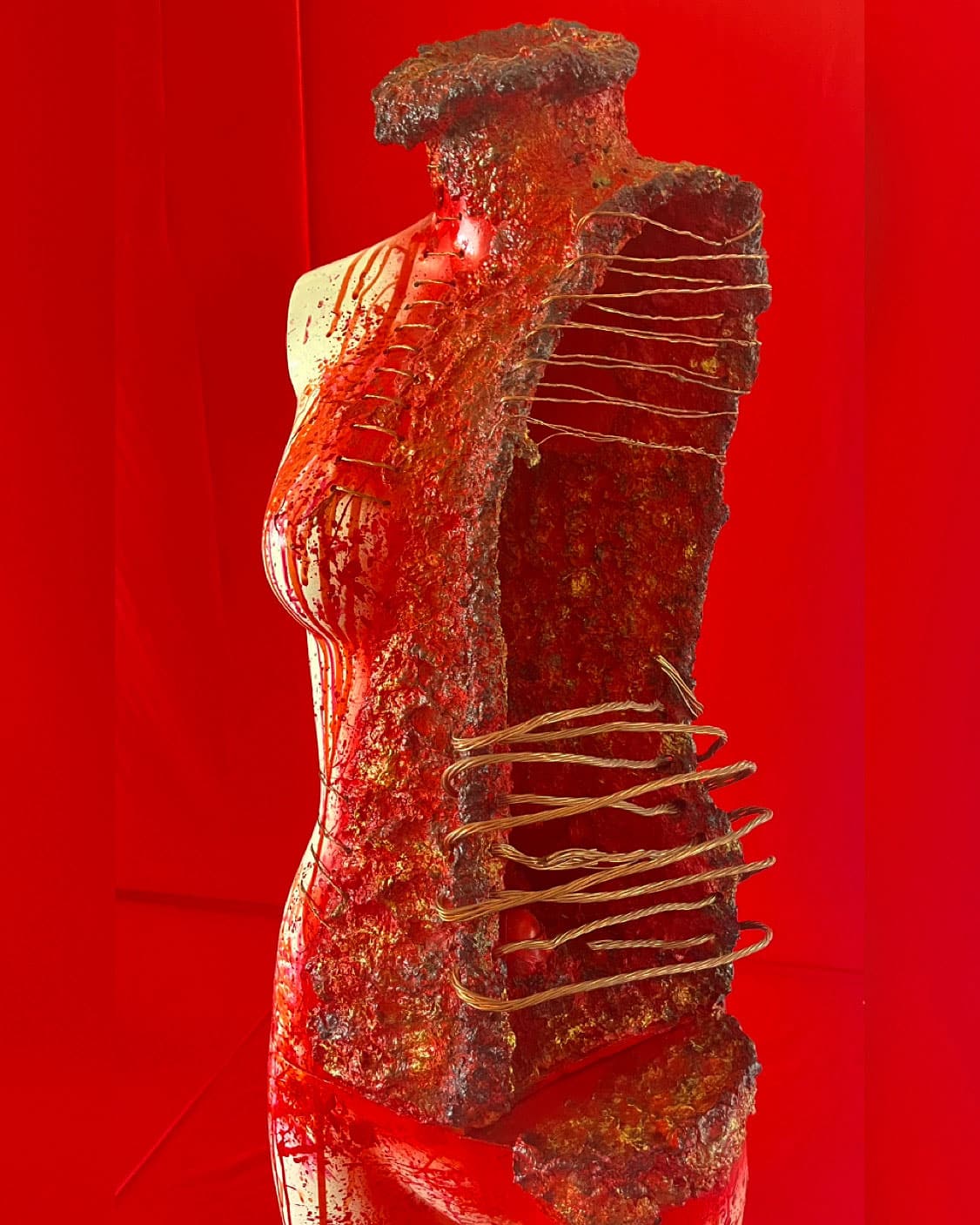 “Eternity” es una instalación multidisciplinar que reflexiona sobre la trascendencia del ser humano y su capacidad de resiliencia frente a la fractura. A través de la intervención de maniquíes con papel maché, cerámica y suturas de cobre, la obra presenta cuerpos atravesados por la herida pero sostenidos por la posibilidad de reconstrucción. Cada figura encarna el proceso de recomposición espiritual y material, afirmando que la eternidad no es permanencia estática, sino persistencia transformada.